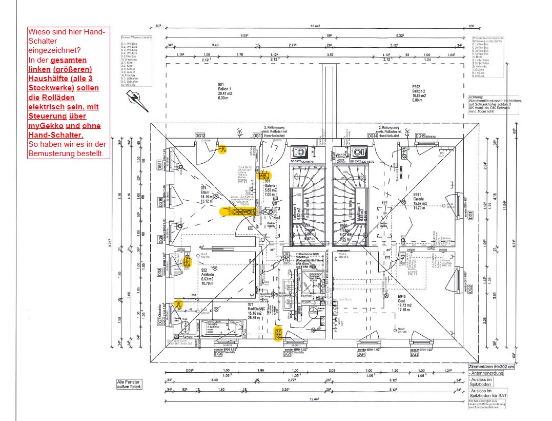Während der Bemusterung werden ja die Elektro-Pläne, welche man besprochen hat, an die technische Abteilung gesendet und dort ins Reine übertragen. Am 2. Tag bekommt man diese zurück. Da war leider im DG immer noch Schalter für die Rollläden eingezeichnet. Der Mitarbeiter der Firma hoch hat dann nochmal eine Email an die Technik Abteilung geschrieben und auf die Pläne einen Hinweis geschrieben, dass die gesamten Rollläden NUR über MyGekko gesteuert werden sollen. Diesen Plan (also mit dem Hinweis in Rot) haben wir dann unterschrieben, damit die Bemusterung abgeschlossen ist. Die Technik Abteilung sollte dies nochmal ändern.